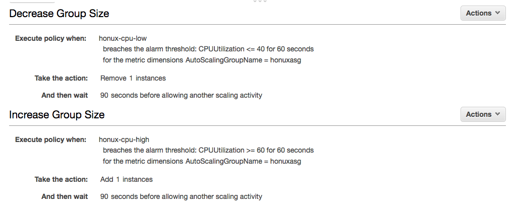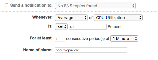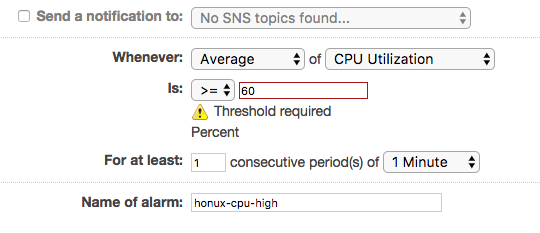 (4) Increate Group Size 에서 Add new alarm 선택, 이후 대화상자에서 아래처림 입력후 Create Alarm 선택
