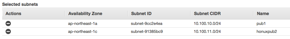 (5) Select Subnets 이 생기면 2개의 public subent 옆에 있는 + 단추를 클릭한다.