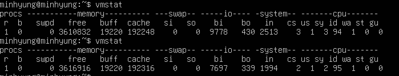 리눅스/유닉스 계열 명령으로 가상 메모리 현황을 확인할 수 있는 방법을 학습하고 정리했다.